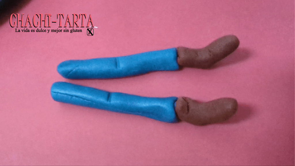 Hice las piernas sobre la marcha, con fondant de color azul y las botas marrones, las coloqué a manera de estar sentado y posteriormente incrusté el cuerpo con el palillo de madera.
