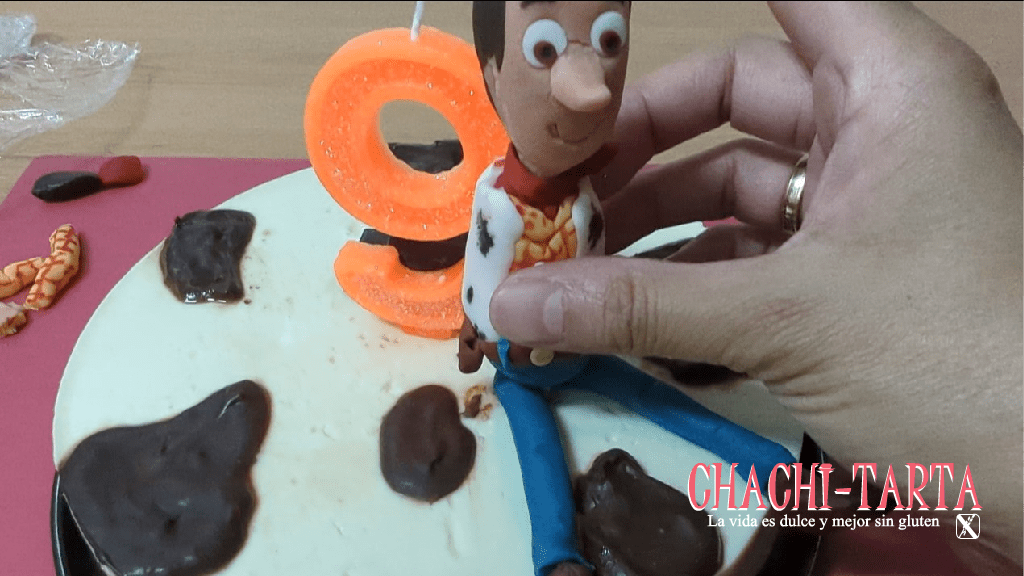 Una vez que la tarta gelificada, hice unas manchas con chocolate negro fundido, simulando el chaleco con piel de vaca que lleva Woody, dejé otro rato en la nevera y posteriormente desmonté para continuar con la desastrosa decoración 😅