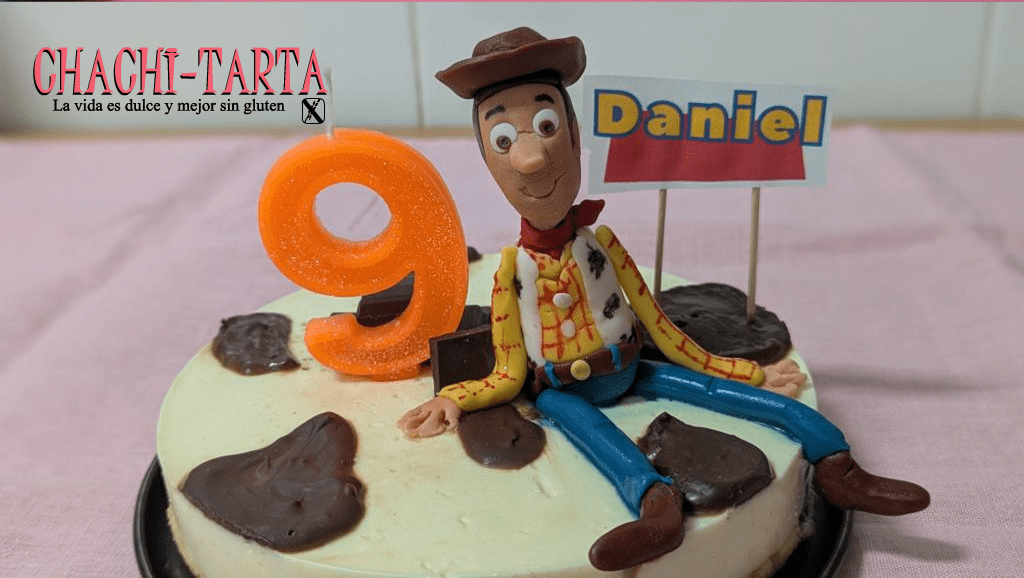 La tarta, en esta ocasión es una tarta fría de chocolate blanco con base de galletas tipo María sin gluten, se prepara rápidamente y es una opción ideal para el verano, la pena es que como decía antes la idea de decoración no fue muy acertada, más bien fue una pésima idea haberle colocado decoración de azúcar por encima, de verdad NO te recomiendo hacer esto. Pobre Woody casi no llega a soplar las velas! 😆 en fin, aquí te dejo la receta de la tarta porque eso si estaba muy buena 😁🤩😅