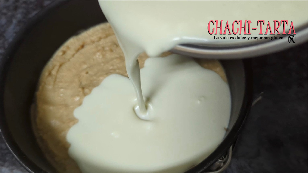 Por otra parte trituramos el paquete de galletas María (en nuestro caso sin gluten) y las volcamos en el molde. Yo siempre uso uno de aluminio con base desmontable para que luego no cueste sacarla.
