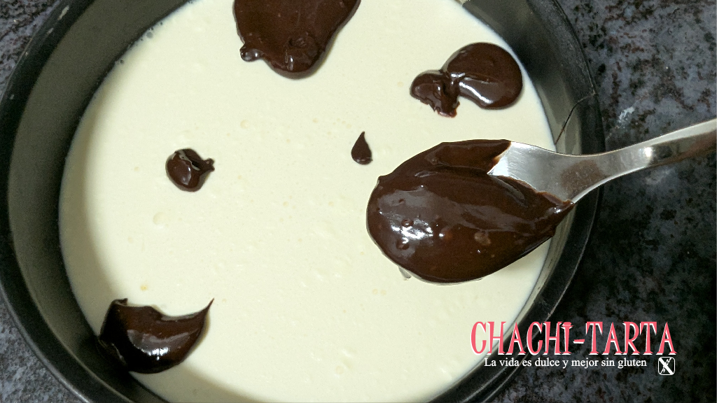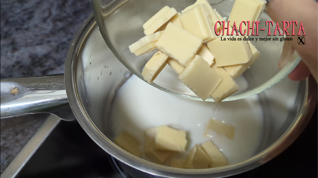 Posteriormente añadimos poco a poco el chocolate blanco cortado en trocitos y continuamos removiendo hasta que no queden grumos, retiramos del fuego y dejamos templar.