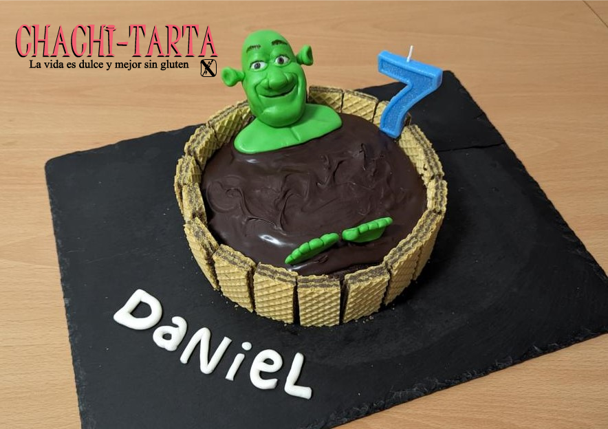 Y se llegó el día!!, por fin hemos celebrado el cumple oficial de Dani, 7 añitos llenos de emociones, aventuras y de poner todo patas arriba!!… la tarta está inspirada en otro de sus personajes favoritos del momento: Shrek!… por supuesto libre de gluten.